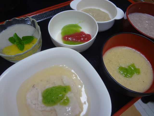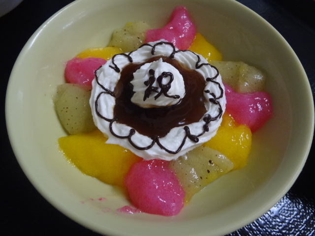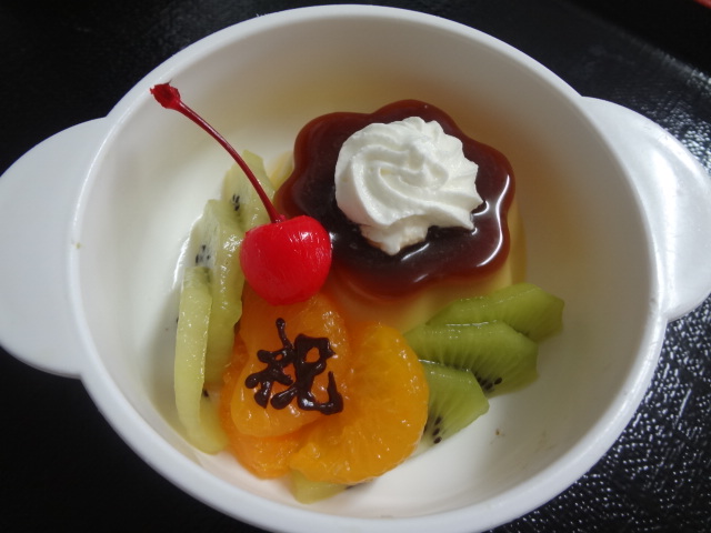 今回のお誕生者の方はソフト食をお召し上がりになっていらっしゃるので色がきれいに出る素材を使用したお料理をご提供しました。通常ならば、デコレーションケーキをお作りしますが、今回はそのままでもお召し上がりいただけるプリンアラモードをご提供しました。