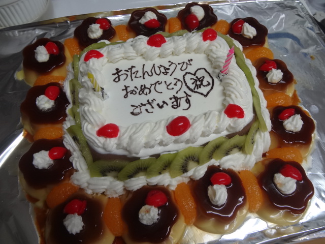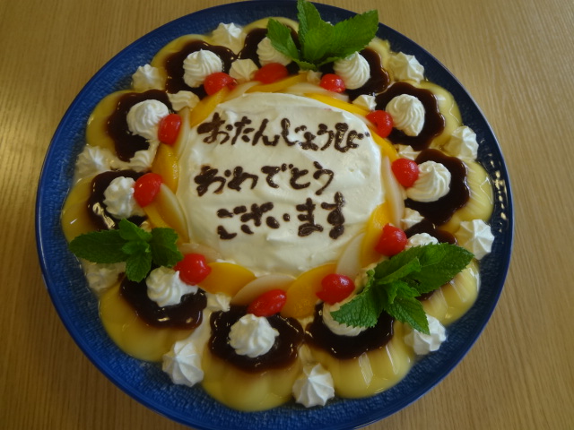 今回お誕生日を迎えられる利用者様の大好きなプリンでアラモードデコレーションバージョンを作りました。利用者様の大好きなものを取り入れた、しらぬい特製のケーキを毎回ご提供しています。