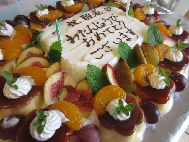 おやつのデコレーションはミキサー食の方が主役でしたので、プリンアラモードにしました。フルーツは秋らしい、ぶどうといちじくを使用しました。見た目がとっても秋らしく、いろどりも自然でボリューム満点でした。