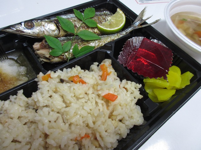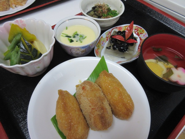いつもはお赤飯ですが、今回はいなりずしをご提供しました。みなさん、さすがお寿司は大好きな様で殆ど残されませんでした。お野菜もいつもはなかなかできない飾り切りをあしらって見た目に楽しいお食事をご用意させていただきました(●^o^●)