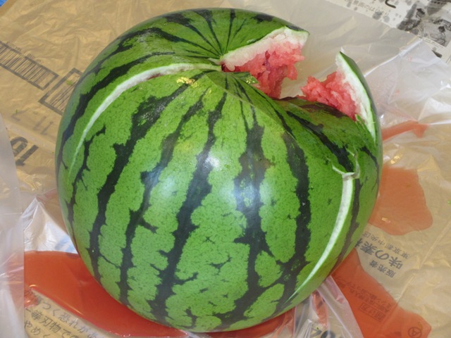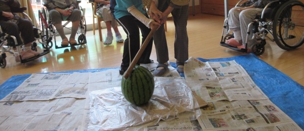 夏の風物詩といえば「スイカ割り」。昔を思い出されたのか、はちまきを巻いたからか、皆さんいつも見ないような気合の入りよう!しっかり、棒を持って思いっきり叩いていました。男性の方には、さらにびっくり、いつもはあまり動かれない方でも、剣道の素振りをするように何回もスイカを叩いていらっしゃいました。明日は肩こりをされはしないかちょっと心配(*^。^*)しかし、スイカはかなり大きいのでびくともしませんでした。かなり悔しそうでしたが、ついに、いつもか弱い女性職員がパリッと割って終わりました。割れた時には、スイカの中心は叩かれ過ぎてスポンジ状になり、美味しそうなジュースが外に流れていました。毎年一番美味しい部分が、スポンジになってしまうから残念美味しい割り方はないのでしょうか?