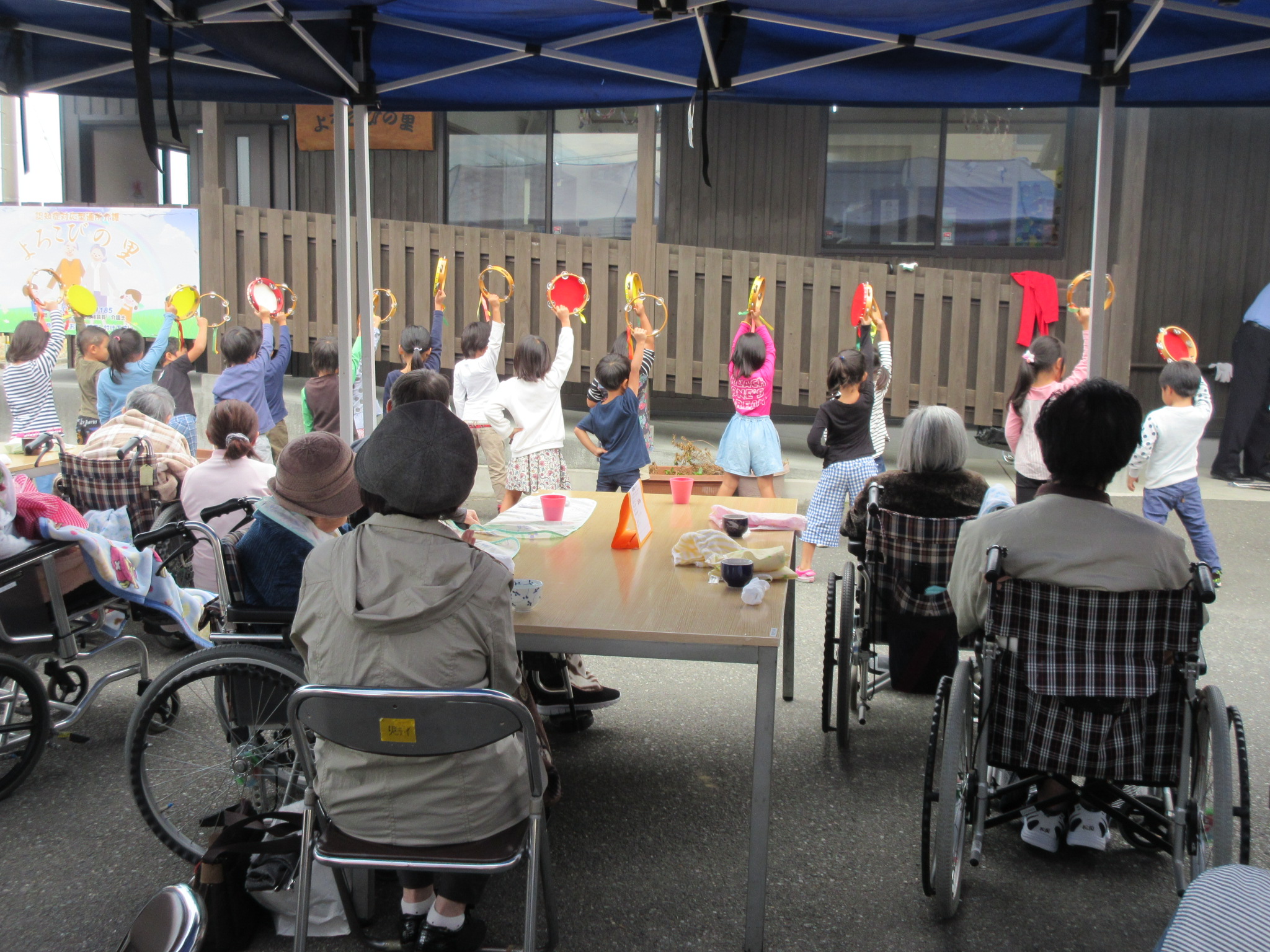 お天気☀が良い中で、しらぬい保育園児と認知症対応型通所介護 よろこびの里、有料老人ホームしらぬいの3事業所、ご家族様、ケアマネ様をお招きしての総勢90名近くのパーティーを行いました。可愛い保育園児のお遊戯を見て、そのあと皆さんでお食事となりました。メニューはさんまの炭火焼、きのこごはん、けんちん汁、フルーツゼリー他。久々の一家団欒お楽しみいただけたでしょうか?羽釜で炊いたご飯は4升!失敗が許されなかったためとても緊張しました。